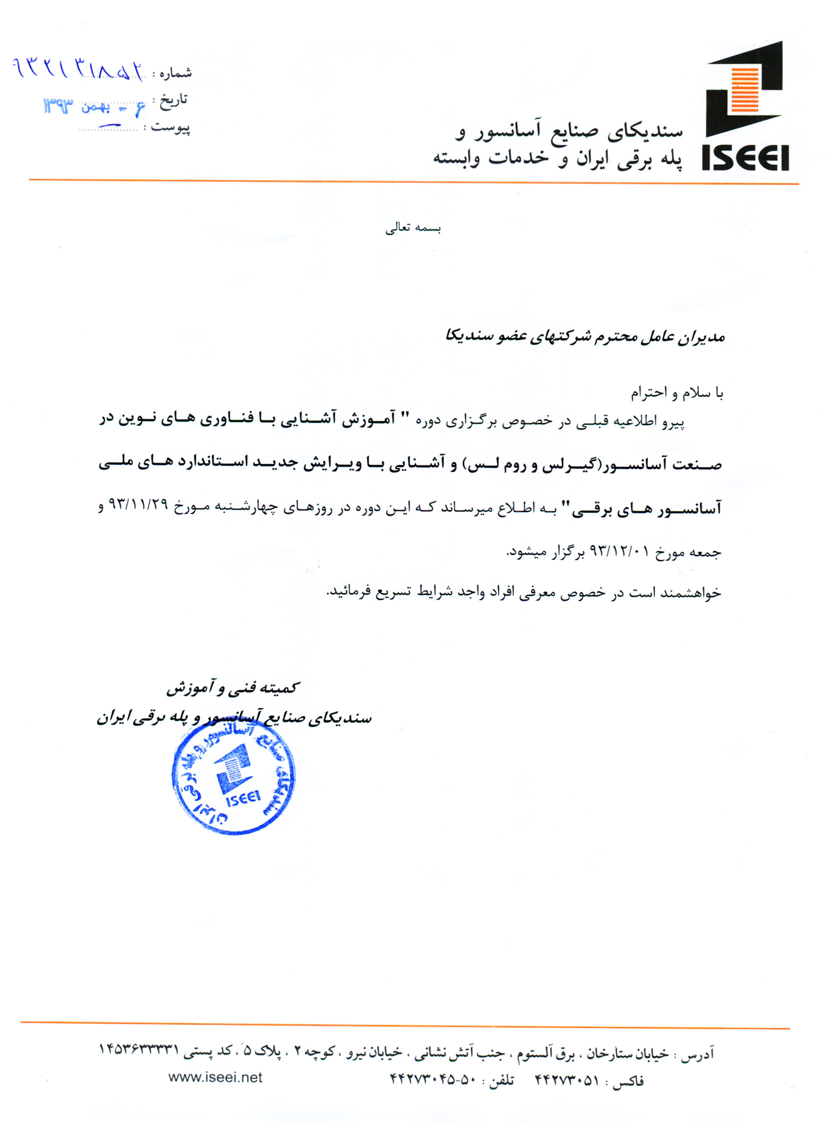 پیرو اطلاعیه قبلی در خصوص برگزاری دوره ” آموزش آشنایی با فناوری های نوین در صنعت آسانسور(گیرلس و روم لس) و آشنایی با ویرایش جدید استاندارد های ملی آسانسور های برقی” به اطلاع میرساند که این دوره در روزهای چهارشنبه مورخ ۹۳/۱۱/۲۹ و جمعه مورخ ۹۳/۱۲/۰۱ برگزار میشود.
