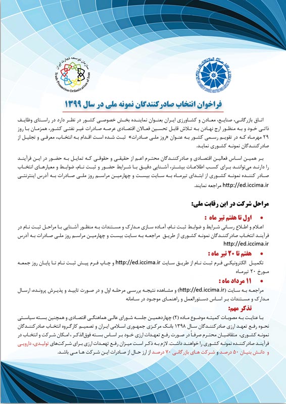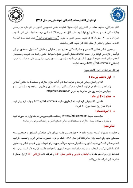 ﻣﺮﺍﺳﻢ ﺭﻭﺯ ﻣﻠﯽ ﺻﺎﺩﺭﺍﺕ ﻫﺮ ﺳﺎﻟﻪ ﺑﻪ ﭘﺎﺱ ﻗﺪﺭﺩﺍﻧﯽ ﺍﺯ ﺗﻼﺵﻫﺎﯼ ﺻﺎﺩﺭﮐﻨﻨﺪﮔﺎﻥ ﺑﺮﺗﺮ ﺩﺭ ﺗﺎﺭﯾﺦ ۲۹ ﻣﻬﺮﻣﺎﻩ ﺑﺮﮔﺰﺍﺭ ﻣﯽﮔﺮﺩﺩ. ﺑﺎ ﻋﻨﺎﯾﺖ ﺑﻪ ﺍﯾﻨﮑﻪ ﺑﺮﮔﺰﺍﺭﯼ ﺑﯿﺴﺖ ﻭ ﭼﻬﺎﺭﻣﯿﻦ ﺩﻭﺭﻩ ﺍﯾﻦ ﻣﺮﺍﺳﻢ ﺩﺭ ﺗﺎﺭﯾﺦ ﻣﻘﺮﺭ، ﺑﺮ ﻋﻬﺪﻩ ﺍﺗﺎﻕ ﺑﺎﺯﺭﮔﺎﻧﯽ، ﺻﻨﺎﯾﻊ، ﻣﻌﺎﺩﻥ ﻭ ﮐﺸﺎﻭﺭﺯﯼ ﺍﯾﺮﺍﻥ ﻗﺮﺍﺭ ﮔﺮﻓﺘﻪ ﺍﺳﺖ، ﺧﻮﺍﻫﺸﻤﻨﺪ ﺍﺳﺖ ﺩﺳﺘﻮﺭ ﻓﺮﻣﺎﯾﯿﺪ ﺑﻪ ﺟﻬﺖ ﺍﻫﻤﯿﺖ ﻣﻮﺿﻮﻉ ﻭ ﺑﻪ ﻣﻨﻈﻮﺭ ﺍﻣﮑﺎﻥ ﺑﺮﮔﺰﺍﺭﯼ ﻫﺮﭼﻪ ﻣﻄﻠﻮﺏﺗﺮ ﺩﻭﺭﻩ ﭘﯿﺶ ﺭﻭ ﻭ ﻣﺸﺎﺭﮐﺖ ﺣﺪﺍﮐﺜﺮﯼ ﻓﻌﺎﻻﻥ ﺍﻗﺘﺼﺎﺩﯼ، ﻣﺮﺍﺗﺐ ﺑﻪ ﻧﺤﻮ ﻣﻘﺘﻀﯽ ﺑﺮﺍﯼ ﺑﻪ ﺍﻋﻀﺎﯼ ﻣﺤﺘﺮﻡ ﺍﻃﻼﻉ ﺭﺳﺎﻧﯽ ﮔﺮﺩﺩ. ﺿﻤﻦ ﺍﺭﺳﺎﻝ ﻓﺮﺍﺧﻮﺍﻥ ﺍﻧﺘﺨﺎﺏ ﺻﺎﺩﺭﮐﻨﻨﺪﮔﺎﻥ ﻧﻤﻮﻧﻪ ﺳﺎﻝ ۱۳۹۹ ﺑﻪ ﺷﺮﺡ ﭘﯿﻮﺳﺖ ﺍﺷﻌﺎﺭ ﻣﯽ ﺩﺍﺭﺩ: ﻋﻼﻗﻤﻨﺪﺍﻥ ﻣﯽﺗﻮﺍﻧﻨﺪ ﺟﻬﺖ ﮐﺴﺐ ﺍﻃﻼﻋﺎﺕ ﺑﯿﺸﺘﺮ ﺩﺭ ﺧﺼﻮﺹ ﺭﻭﯾﺪﺍﺩ ﻭ ﺁﮔﺎﻫﯽ ﺍﺯ ﻧﺤﻮﻩ ﻓﺮﺍﯾﻨﺪ ﺍﻧﺘﺨﺎﺏ ﺻﺎﺩﺭﮐﻨﻨﺪﮔﺎﻥ ﻧﻤﻮﻧﻪ ﺳﺎﻝ ۱۳۹۹ ﺑﻪ ﺳﺎﯾﺖ ﺑﯿﺴﺖ ﻭ ﭼﻬﺎﺭﻣﯿﻦ ﻣﺮﺍﺳﻢ ﺭﻭﺯ ﻣﻠﯽ ﺻﺎﺩﺭﺍﺕ ﺑﻪ ﻧﺸﺎﻧﯽ http://ed.iccima.ir ﻣﺮﺍﺟﻌﻪ ﻧﻤﺎﯾﻨﺪ